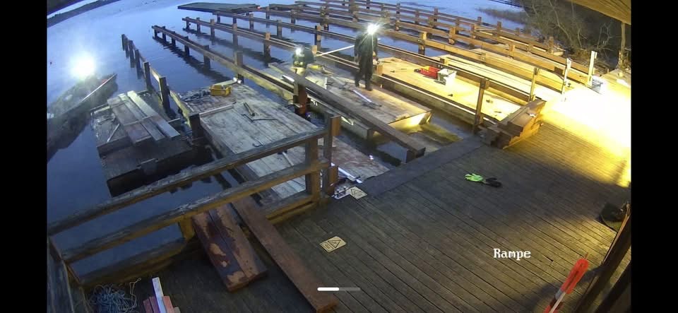 Så er nederste bjælkelag lagt på den nye bro, og dermed er der igen åbent for udgang mod søen.